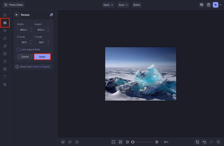 The Resize tool allows you to quickly resize your image. This is helpful if you need to resize it for a print. I usually achieve resizing with the Crop Tool as mentioned above, but sometimes you need to work in percentages while keeping the same ratio. This tool helps you to dial in on the specifics of the sizing you need.