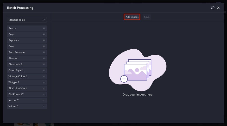 You can either click the Add Images button or drag and drop the images from your files. There's no restriction on the number of images you can resize simultaneously, the beauty of batch photo editing!