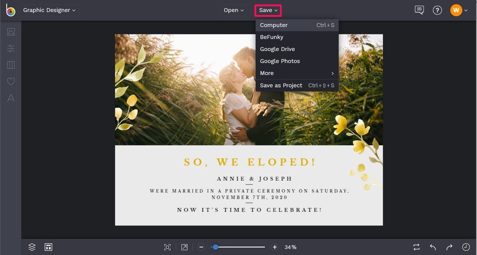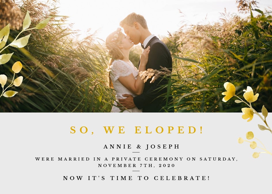 Thanks to BeFunky’s Elopement templates in our Graphic Designer, spreading the good news just got a whole lot easier! Thinking of foregoing printed announcements? You can also opt to share your exciting announcement via social media, email, or text message using the digital file instead!