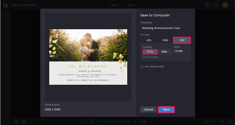Once you’re happy with your design, select Save at the top of your screen. Select Computer to save it to your computer. You will want to select the PDF tab and then select Print.