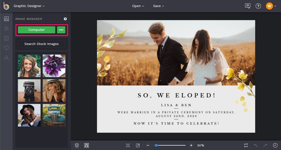 To get started designing your own Elopement Announcement, head to BeFunky’s Graphic Designer. Select the Templates tab and then type ‘Elopement’ into the search bar and hit enter.
