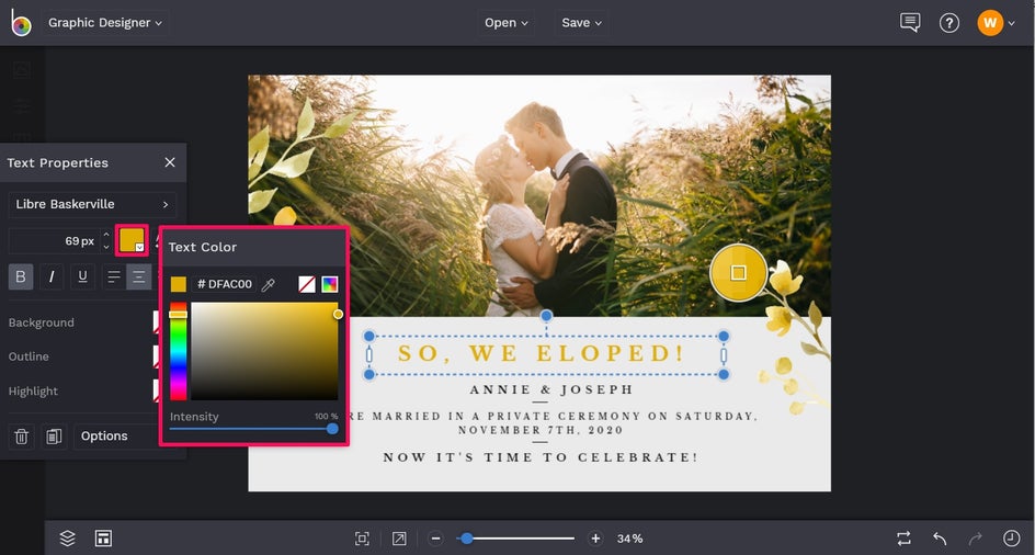If you’re planning to elope, or recently have, you can still spread the word to your friends and family. BeFunky’s Graphic Designer is home to plenty of Elopement Announcement templates – so you have one less worry about designing your announcement. Even without a wedding, you can still choose a color palette that you can showcase in your announcement, Just add your favorite photo, type in your details, and you can alert your friends and family of the big announcement!