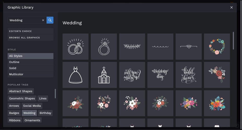 Head to the Graphics tab in the left-hand menu. You can search for and add any graphic elements you like by selecting Search Graphics.