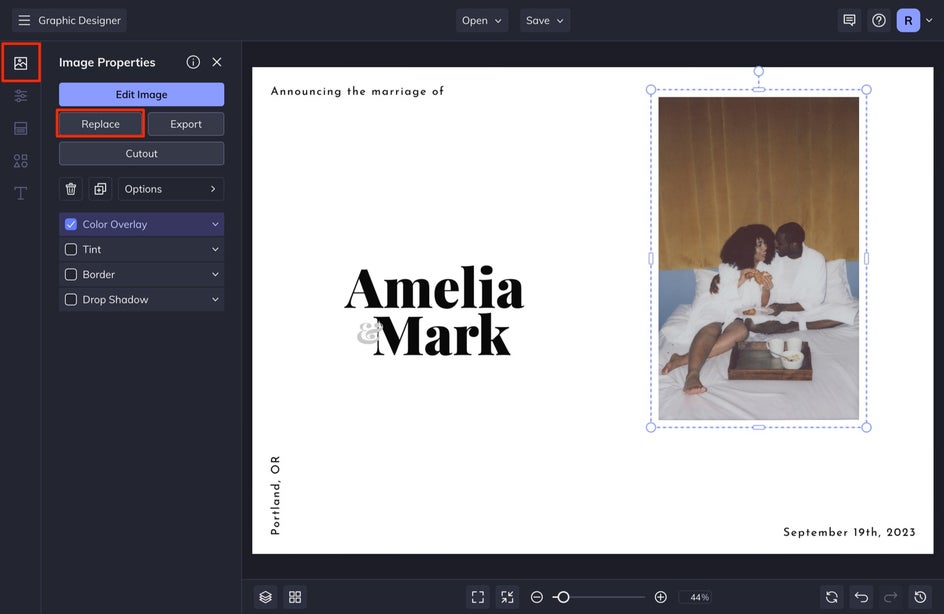 Head to the Image Manager and select Computer to upload a photo of you and your partner. You can either drag and drop this photo over the existing photo or click on the existing photo, then from the Image Properties panel, click Replace. This allows you to open a photo directly from your Computer’s files.