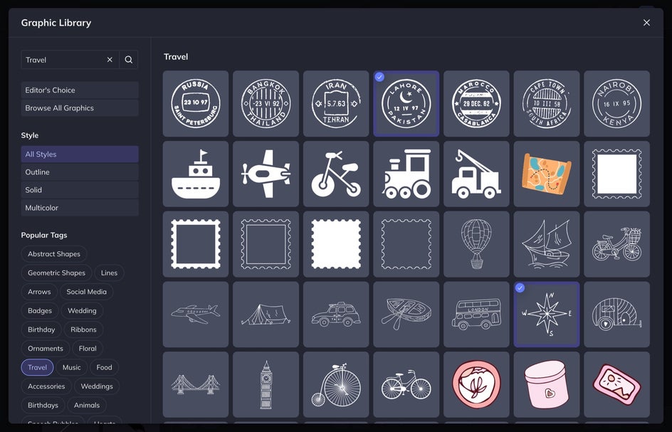 Search for your graphics by using the search bar in the top left corner. You can also select from the Popular Tags list below. You can also select the Style you want, if you prefer to search for graphics that are multicolor or outline only.
