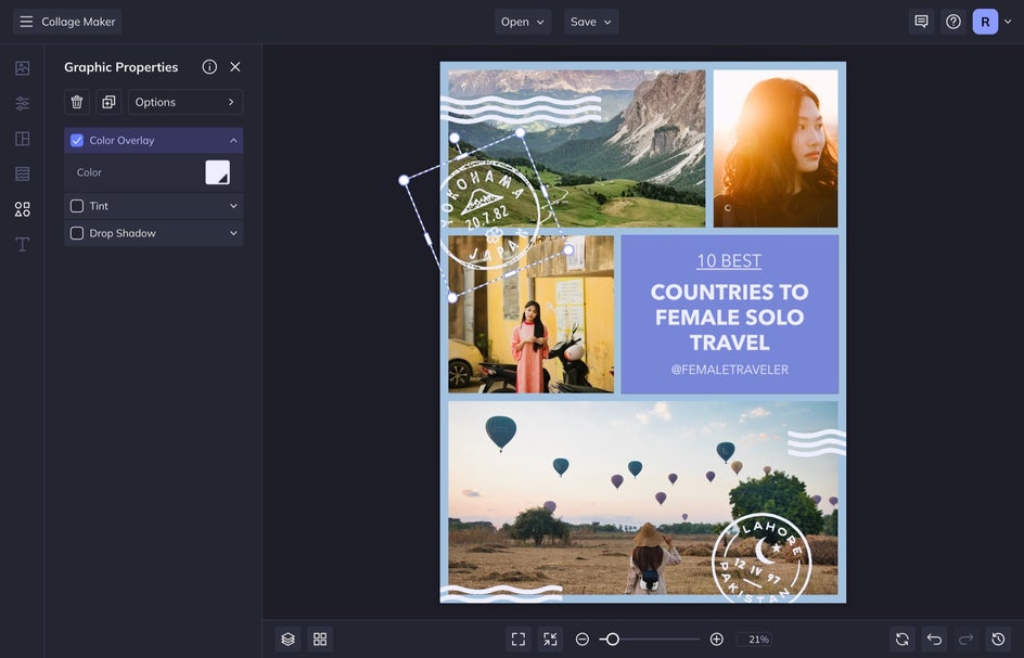 Drag and drop the graphics you want to add to your collage. Next, select the graphic that you want to customize. This opens the Graphic Properties menu, where you gain access to different graphic customizations. From here, you can customize the Color Overlay, Tint, Drop Shadow, and more.