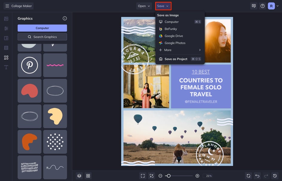 Save your collage by using the Save dropdown menu at the top of the screen. Select your desired location and file type.