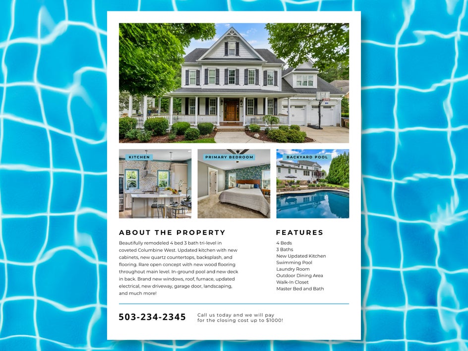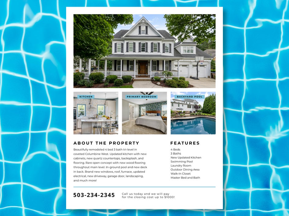 High-quality flyers are a real estate essential, and nothing ruins a printed piece faster than a dull or unbalanced photo. After applying the AI Image Enhancer, drop your edited property images into one of BeFunky’s professionally designed real estate flyer templates to create custom materials in minutes. Add branding, pricing, property specs, and agent contact info – all without needing to outsource your graphic design.