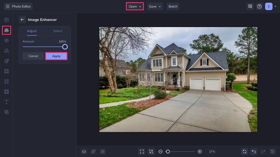 Outdoor shots often suffer from harsh lighting, cloudy skies, or awkward shadows that make a home look less inviting than it is. The AI Image Enhancer automatically corrects for these common issues, bringing balance and vibrancy to exteriors with just one click. And for even more compelling photos, you can pair the AI Image Enhancer with BeFunky’s Sky Replacer.