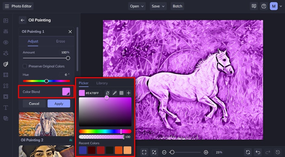 In this image, we added a purple color blend. The result is an oil painting image now dominated by this shade, rather than containing multiple different colors, as it did originally. Therefore, the Color Blend tool is great for tweaking an Artsy effect so it suits a particular color, especially for your branding needs.