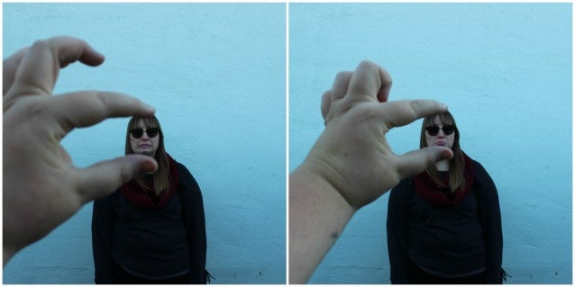 The adorable person being “held” is my coworker Juliana, and the adorable person holding her is my coworker G. I had G stand about two feet away from me and Juliana stand halfway down the hallway in our building and then positioned G’s hand to give the illusion that he was holding Juliana. I wanted to keep the colors in the photo mostly muted, so I added a bit of vignette and the Cross Process 2 filter from the Photo Editor.