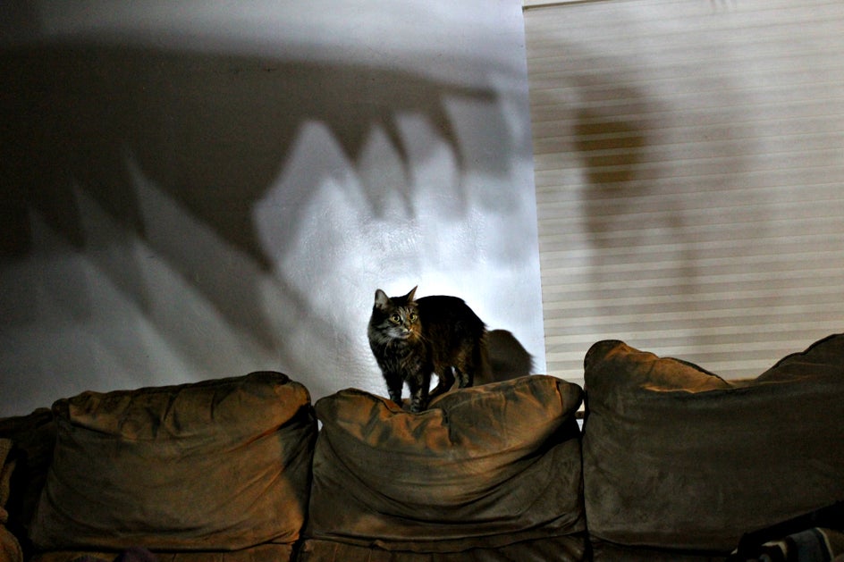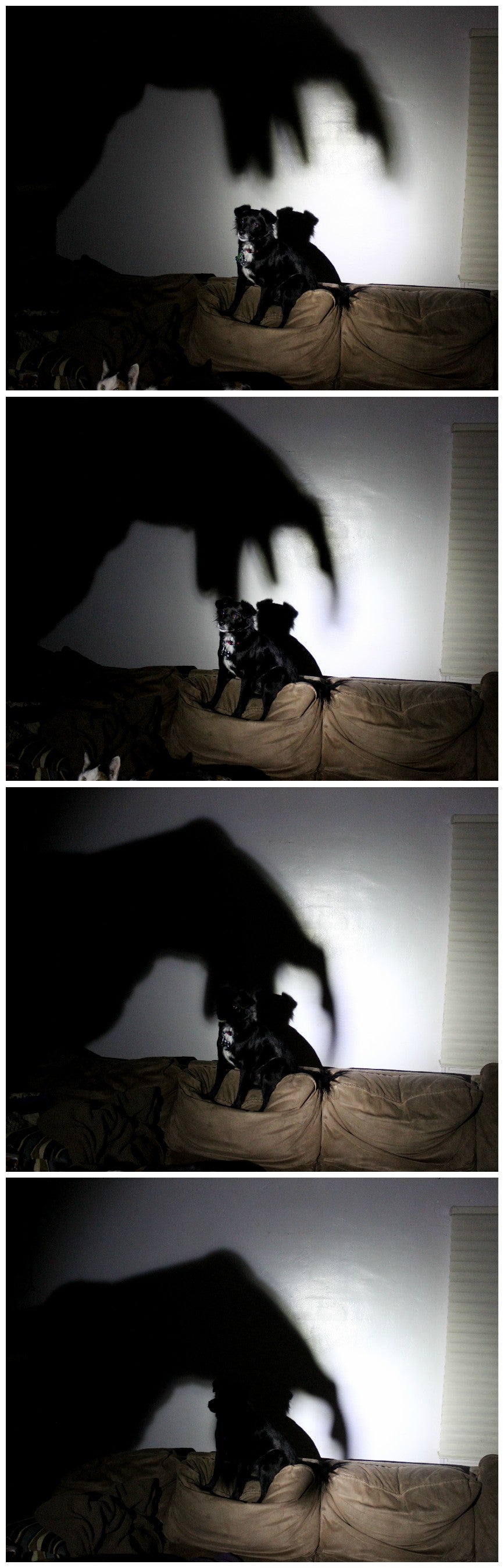 Finally, the next shots I aimed to achieve are what I like to call “shadow monster” shots. To setup these shots I found a bare wall in my living room, put on a head lamp and coaxed my cat onto the back of the couch.