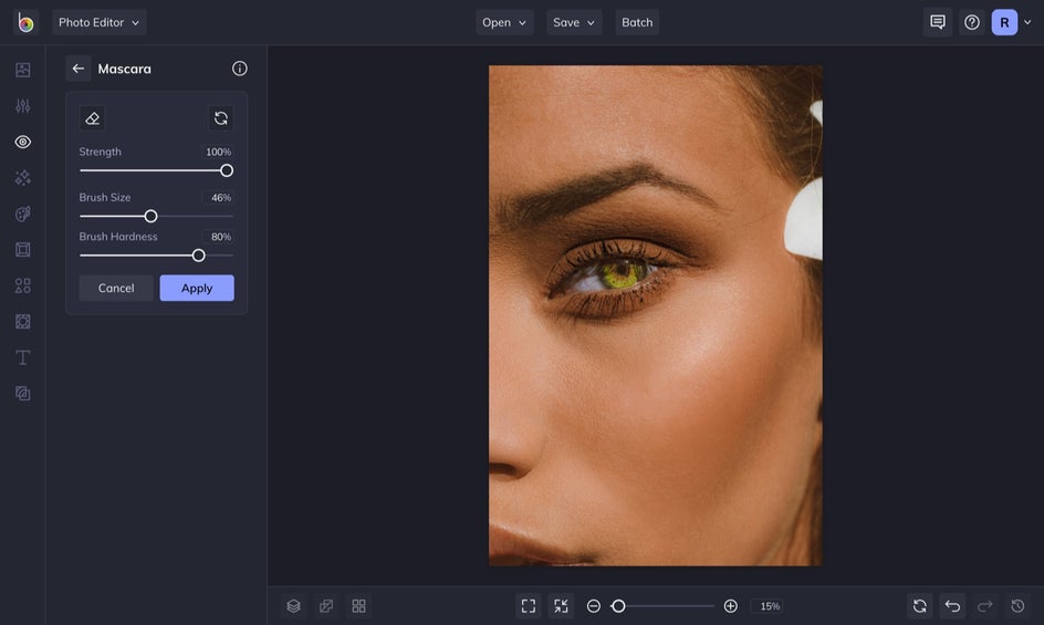 To achieve more dimensional lashes, select the Mascara tool, adjust the brush size, and swipe your brush as close to the lash line as you can. You will see the lashes begin to develop into a darker and more contrasted look. From here, you can use the Strength slider to control how subtle or bold you want your lashes to be.