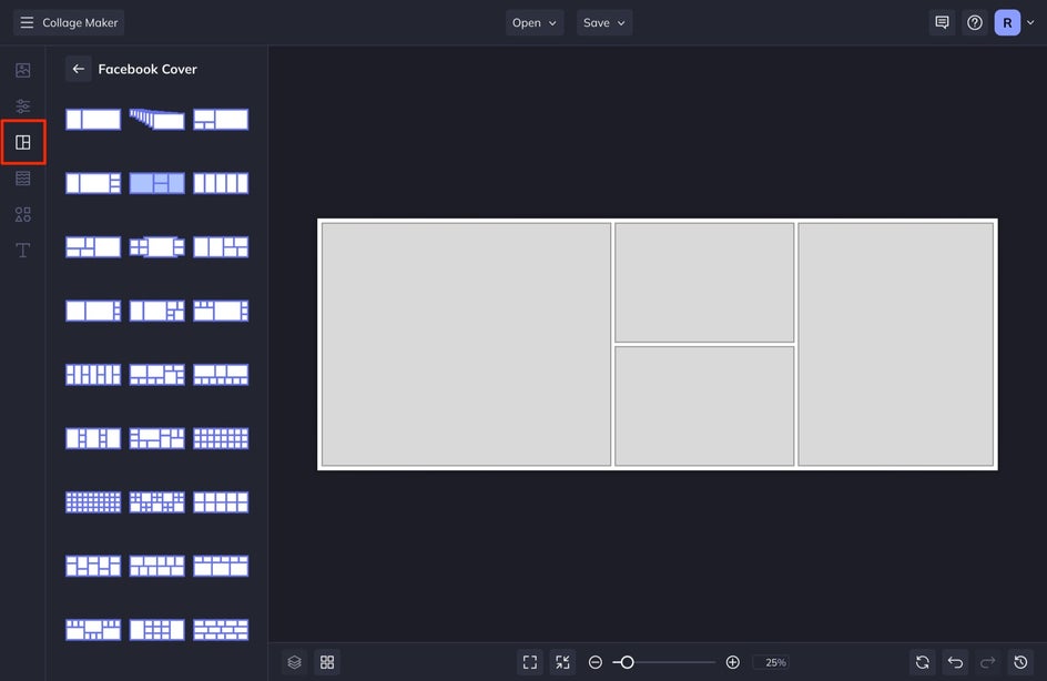 Head to the Collage Maker and open the Layouts tab from the left-hand menu. Under the Facebook Cover category, you’ll find a curated collection of collage presets – all perfectly sized for Facebook’s recommended aspect ratio.