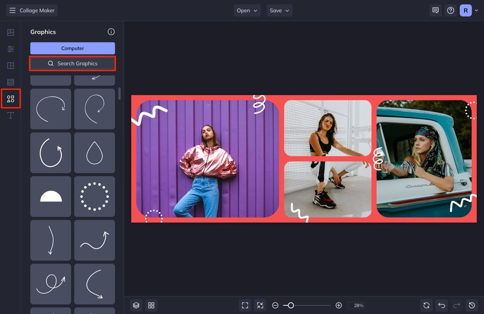 To make your design pop, add decorative elements from the Graphics tab. Use Search Graphics to browse BeFunky’s massive graphic library, then drag, resize, and position them for a playful or professional touch. Let your graphics overlap images or bleed outside the collage boundaries for extra visual interest.