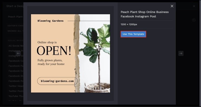 In the Start a Design menu that appears, expand the Social Media category and click on Facebook Posts. Click on a template that takes your fancy, then select Use This Template to get started.