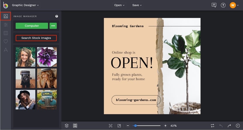 Want to use a stock photo instead? Navigate to the Image Manager tab in the main menu to the left, followed by Search Stock Images to access BeFunky’s huge library of free-to-use images.