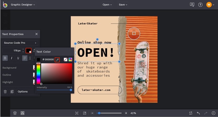 To change the color of the text, for example, click on the Text Color box and select a new color from the palette that appears. You can also use the Eye Dropper Tool to select a color already present in your template, or type in your specific color’s HEX code, if you know it.