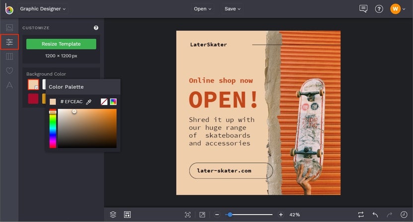 You can also change the background color of your template by navigating to the Customize tab in the main menu on the left. Select a color from the available swatches or choose a custom color.