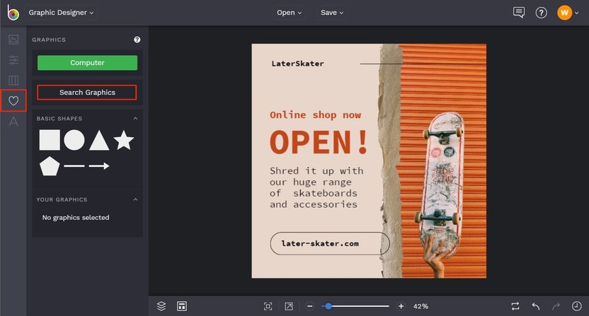 Finally, you have the option to jazz up your Facebook post with some graphics, such as shapes, symbols, lines, and more. To access BeFunky’s massive library of these, just click on Graphics in the main menu to the left, followed by Search Graphics.