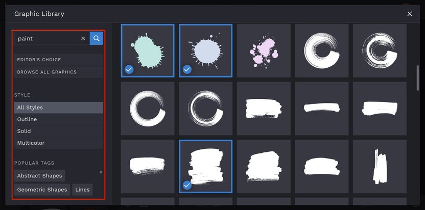 In the Graphic Library that appears, use the search bar, Style filters, and Popular Tags to find the type of graphics you're looking for – there are hundreds to choose from! Just click on all the ones you love to add them to your workspace. You'll find them in the Your Graphics section of the Graphics tab once you close out of the Graphic Library.