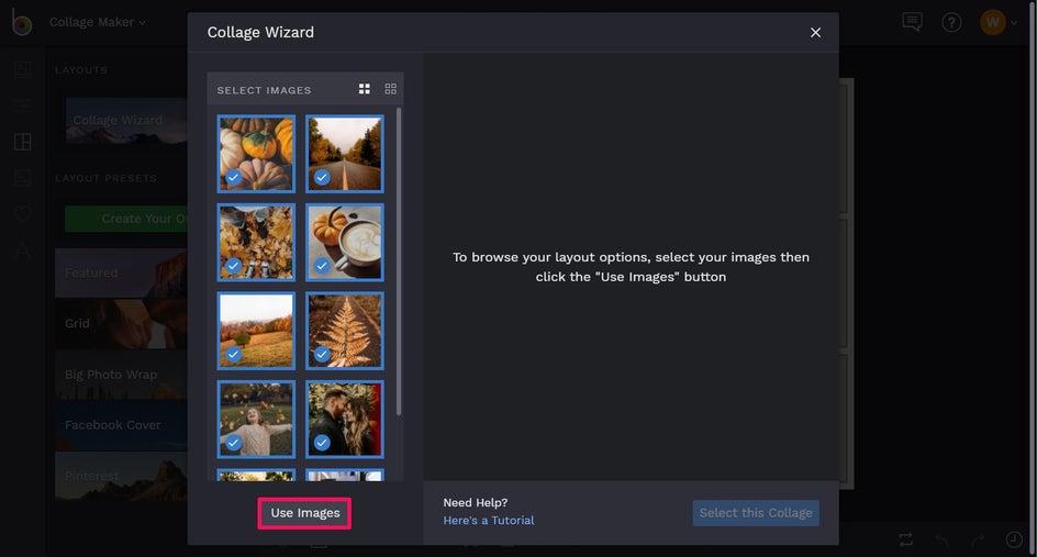 Once your desired photos have been added to the Image Manager, navigate to Layouts in the main menu on the left, then click Collage Wizard. Before the Collage Wizard can automatically generate your collage, you just need to select the images you wish to include in the collage on the left, then click Use Images.