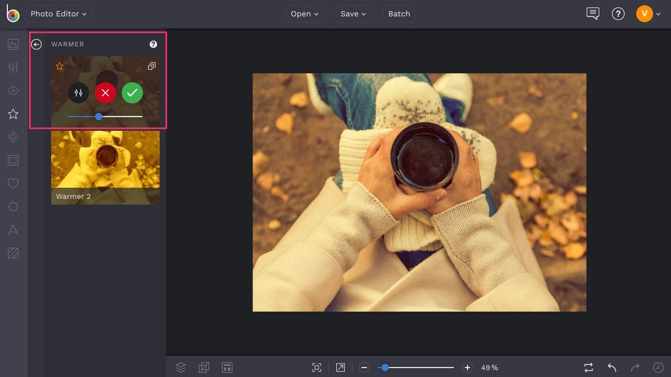 We can then take this warm hue one step further with a Photo Effect. Navigate to Effects in the main menu on the left, then click on Warmer Tones. There are numerous effects here to choose from, so play around with each one to see which looks best with your photo.