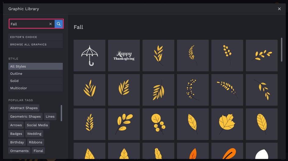 BeFunky also gives you access to a whole library full of fun graphics, including an entire category dedicated to fall! To access these, navigate to Graphics in the main menu on the left, followed by Search Graphics. Then, simply type "Fall" into the search bar in the top-left.