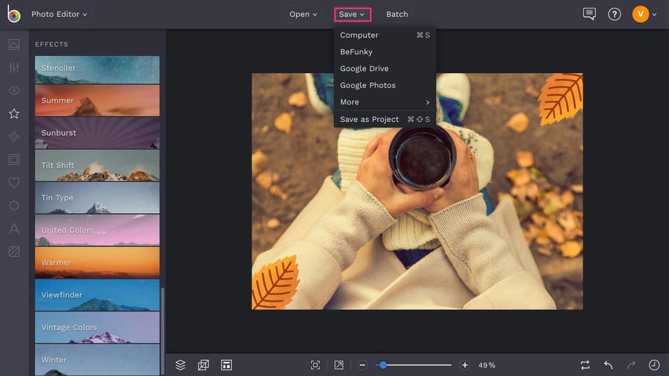 Click Save at the top of the screen, then select your desired save location. You can now upload your fall photo to Instagram to share it with your followers!