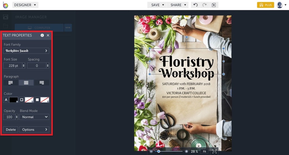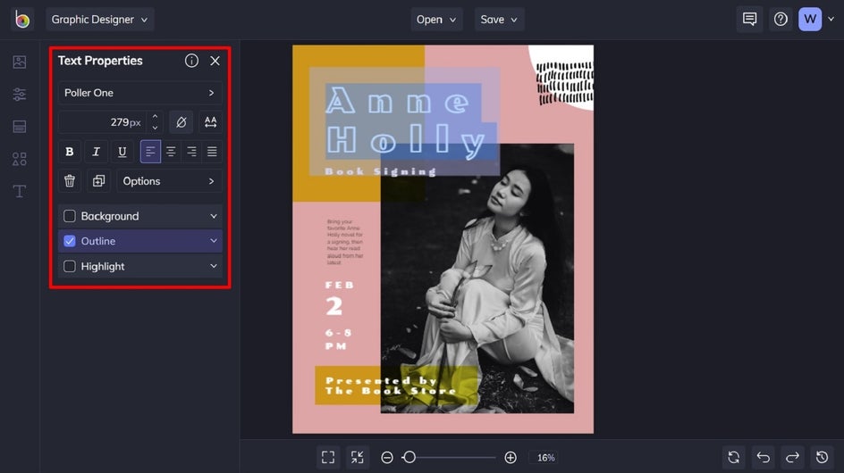 Next, it’s time to edit the existing text on the template to reflect your event’s important details. Simply double-click on a text box and begin typing whatever you want it to say. When you click on a text box, a Text Properties toolbar also appears. From here, you can adjust elements such as the Font, Size, Text Color, Spacing, and more.