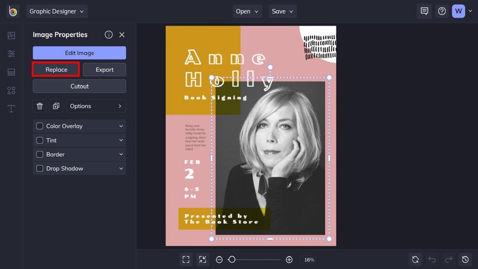 You’ll want to swap out the flyer template’s existing images for ones representing the event you wish to market. To do this, click on any existing photo and an Image Properties panel appears. Click Replace, then select your desired photo from your computer. Repeat this process for every photo you wish to swap.