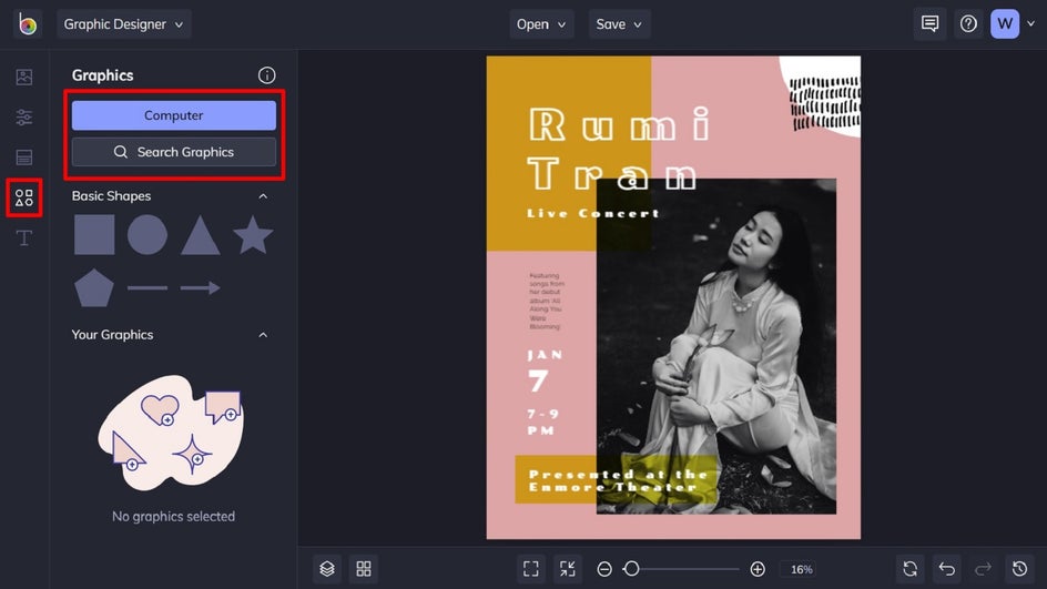 If you wish to add some additional graphics to your template, you can do so by navigating to Graphics in the main menu on the left. Click Computer to upload graphics from your own files, or Search Graphics to access BeFunky’s large library of graphic elements.