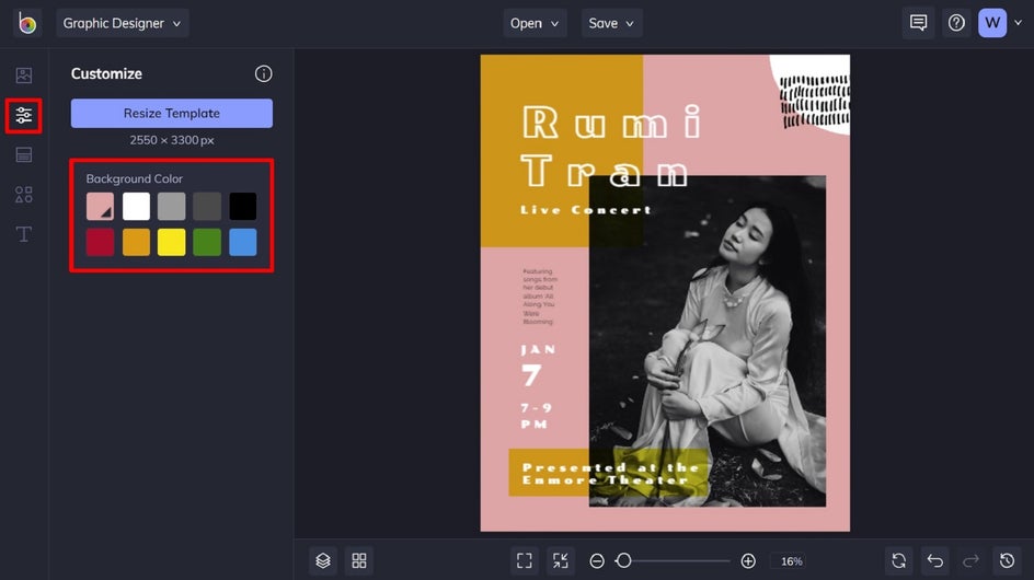If you want to change the background color of your entire template, navigate to Customize in the main menu on the left and select a color swatch of your choosing. Similarly, you can click on the first color swatch (the one with the dropdown arrow) to open the Color Chart, type in the color’s specific HEX Code, or use the Eye Dropper Tool.