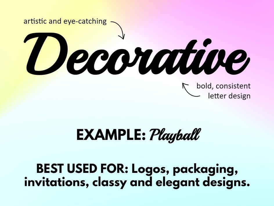 A decorative font typically acts as the focal point of a text-based design and can be paired with serifs and sans serifs as supporting text.