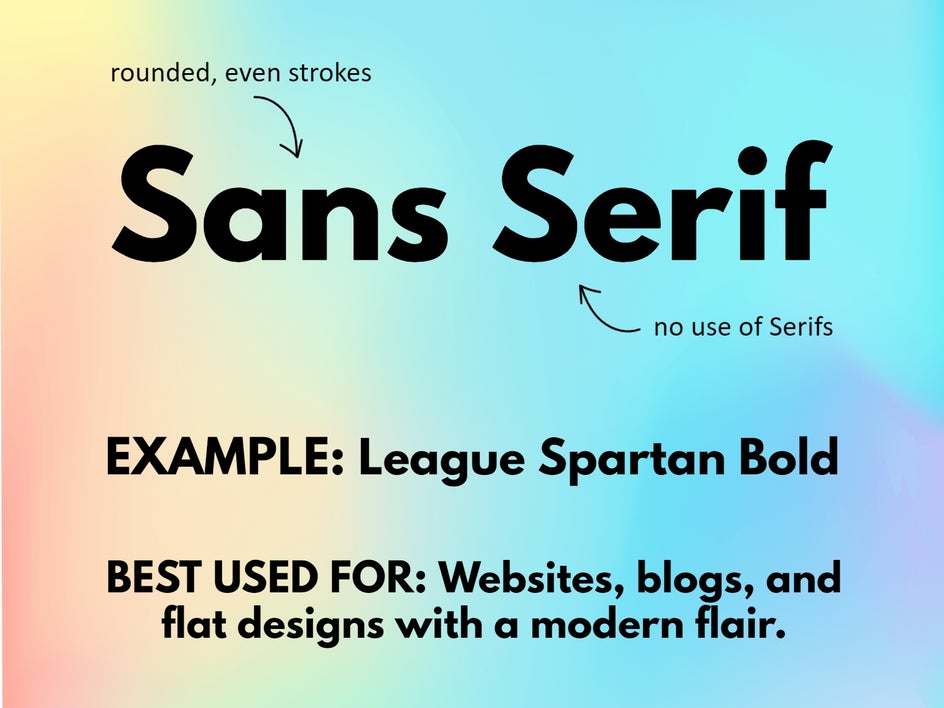 A sans serif font is simply a font without any small strokes, or serifs, attached to each letter. Instead, these fonts use clean, minimal, and semi-rounded details. Their simplistic and modern aesthetic lends well to websites, blogs, and other flat designs.