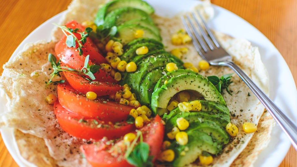 Can’t decide what color surface to use as a backdrop? Try picking an accent color from your meal (i.e., the pop of red from some bell peppers, or the green from a slice of avocado) and matching it to that! White and wooden surfaces also provide elegant neutrality no matter the recipe. The following image combines all of these tips by using a printed fabric against a white background, with some leafy greens to frame: