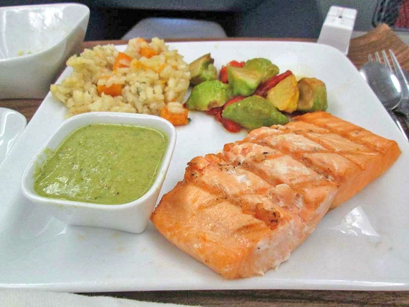 I took a up-close shot of the salmon to show how flavorful it looked. The picture I took of my appetizer was taken with my seat pushed back and my tray placed further away. Take multiple shots so you can choose the best angle.