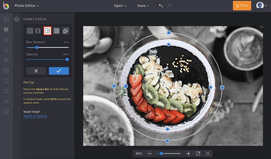 Start by opening up your image in the Photo Editor, navigating to the Edit menu, scrolling to the Blur & Smooth section, and selecting Funky Focus. For a quicker route to Funky Focus, click Command + P simultaneously to pull up BeFunky’s Feature Shortcut, where you can type out the tool you are searching for. When you select Funky Focus, a round target will automatically appear on your screen, but there are several different types of focus that you can use.