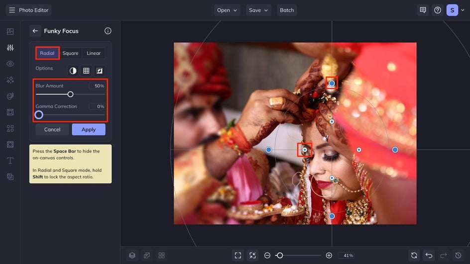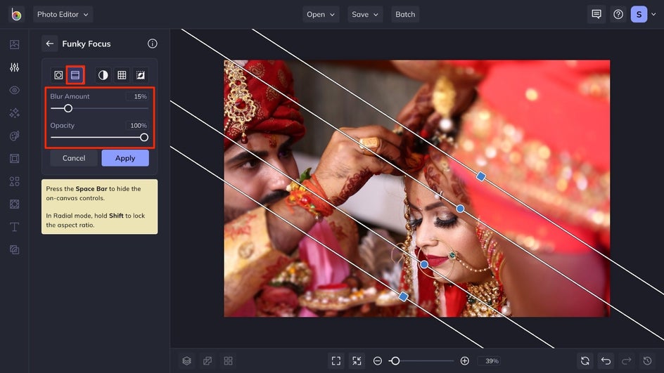This will make a circular-shaped blur using the Radial mode. This is great for focusing on the parts of your photo that matter most. You are able to adjust the size of the highlighted subject by selecting the white and blue dots on the edges of the circle and dragging them in or out based on your desired size.