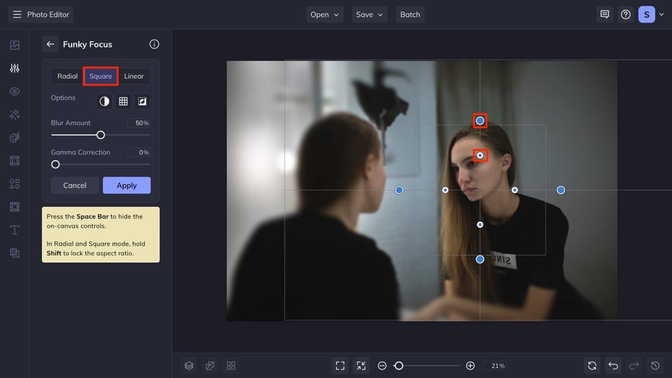The squares work the same as the Radial Focus does, where you are able to adjust the size of the highlighted subject by selecting the white and blue dots on the edges of the square and dragging them in or out based on your desired size of the blur. To adjust the shape to be more rectangle-like instead of square, use the blue dots to adjust the shape. Place the inner square over the part of your photo you want to remain in focus and adjust Blur Amount.