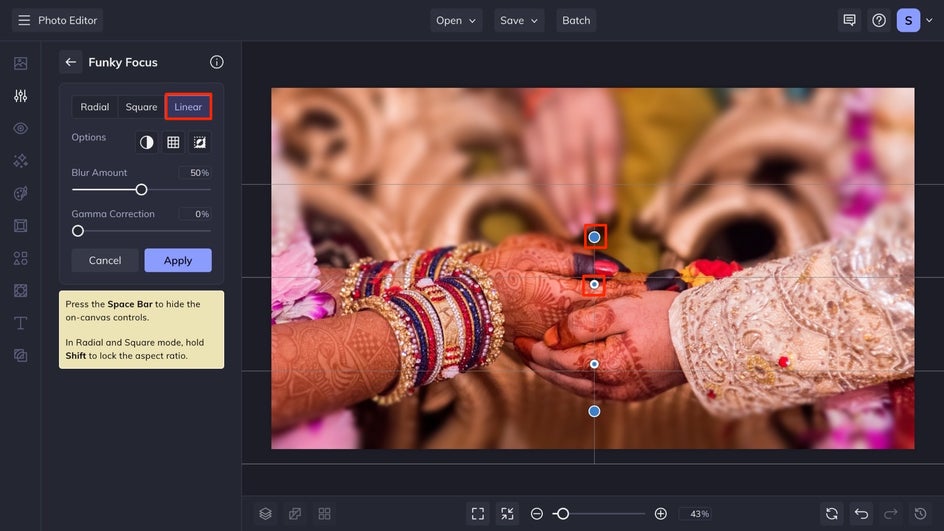 Change perspectives, bend the rules of reality, and add a little funk to your photography with the one-and-only Funky Focus! There is no wrong answer with Funky Focus – every image can do with a little funk, whether you are trying to highlight a subject, or transform your image into the digital age. Get started finding your focus with the Funky Focus tool.