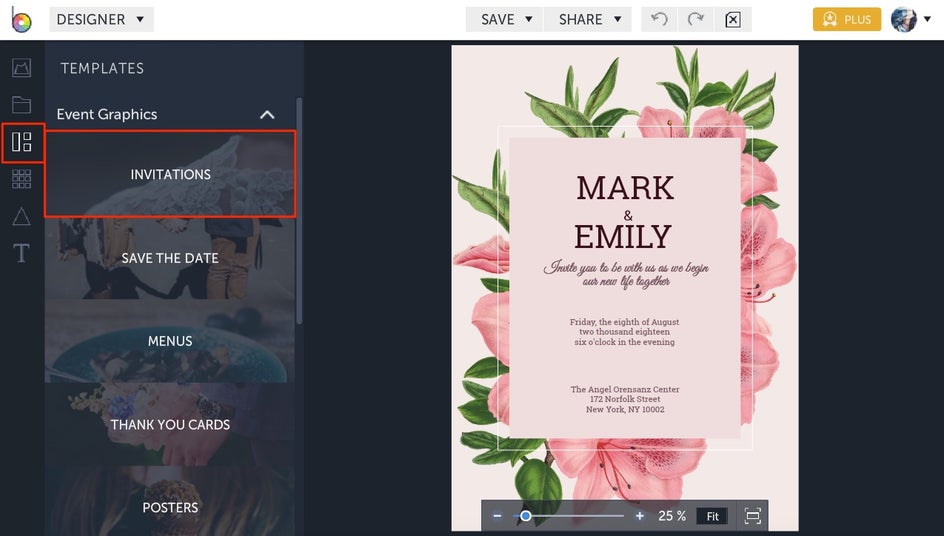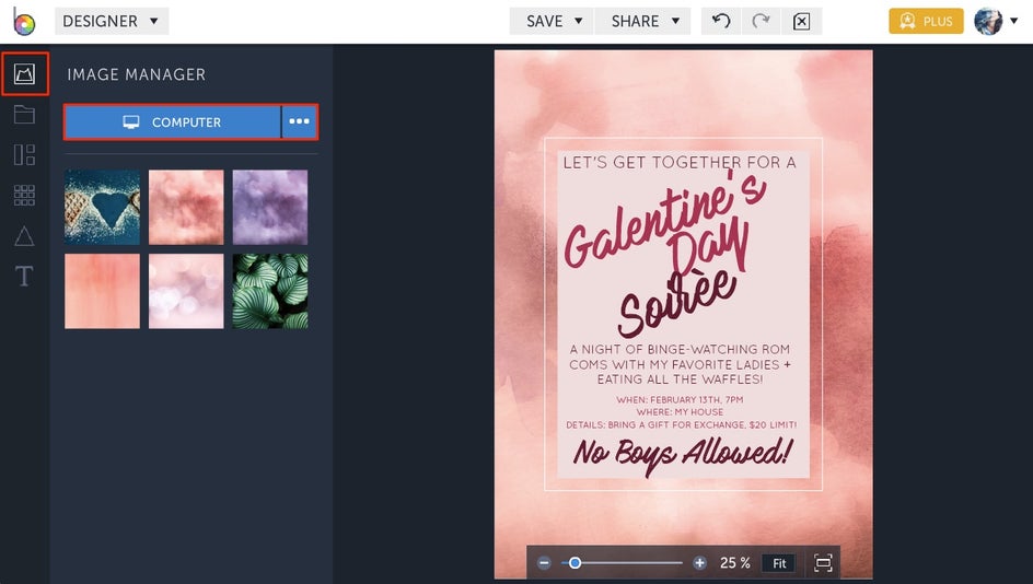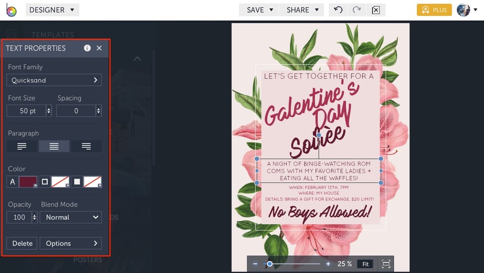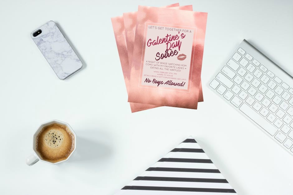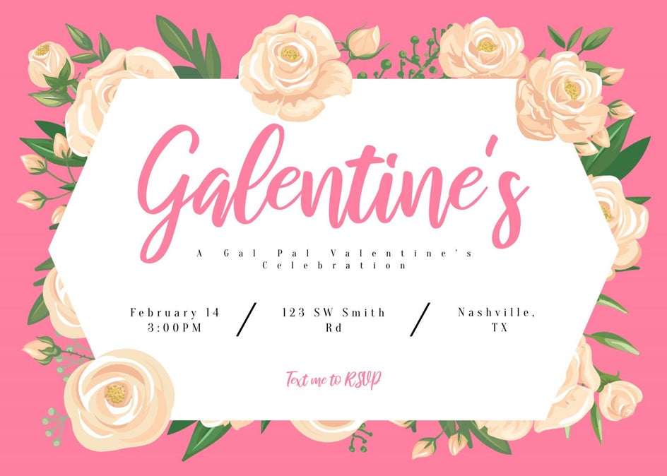 A group text could work for extending your Galentine’s invitation, but why not go all out and make an invite you’re proud of? With the help of BeFunky’s Graphic Designer, you can create the invitation of your dreams to send to your gal pals. Simply search 'Invite' in the Templates section of the Graphic Designer, and click on it to get to work customizing it.