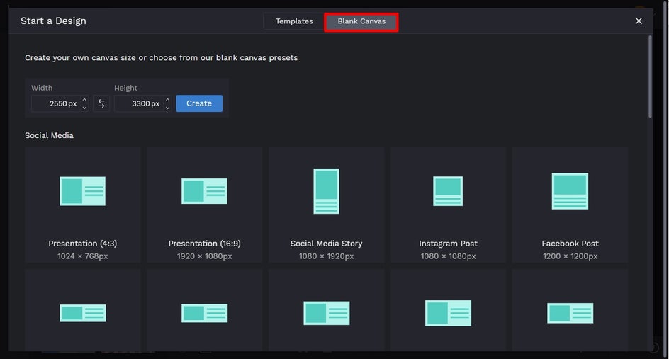 Go to the Graphic Designer and start with a Blank Canvas. You can create your own canvas size or choose from our blank canvas presets.