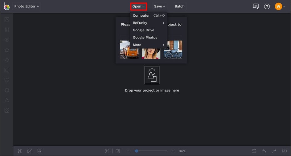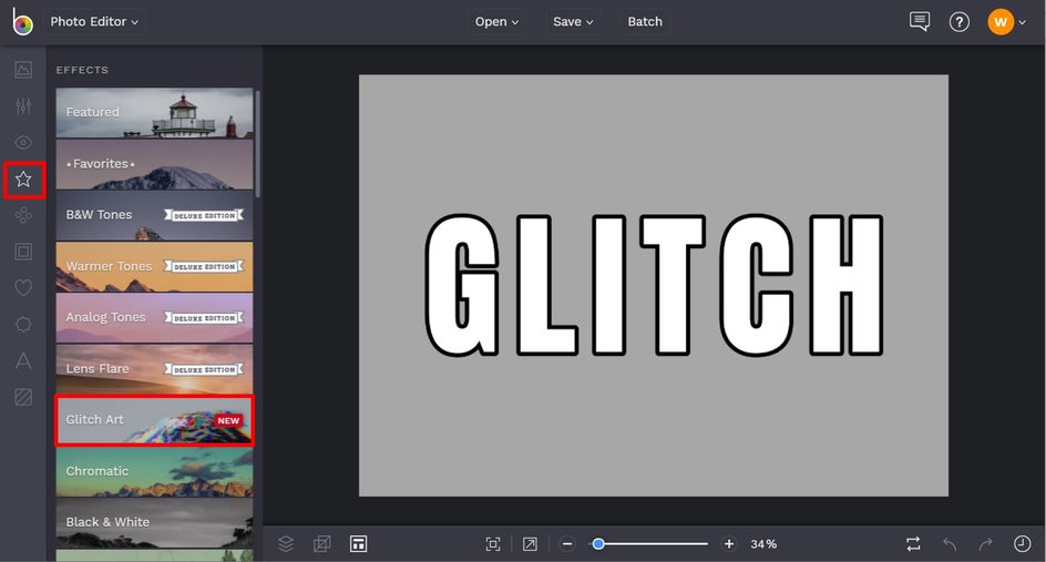 Ready for your Glitch edit? In the top-left of the screen, click Graphic Designer and select Photo Editor from the dropdown menu. This will take you to BeFunky’s Photo Editor.