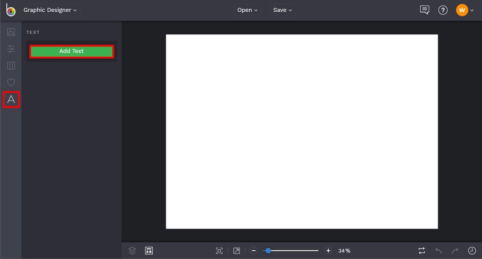 Next, navigate to Text (the ‘A’ symbol) in the main menu on the left. Then, click Add Text. This will insert a new text box onto your canvas. To edit what it says, simply double-click the text box and type your desired text.