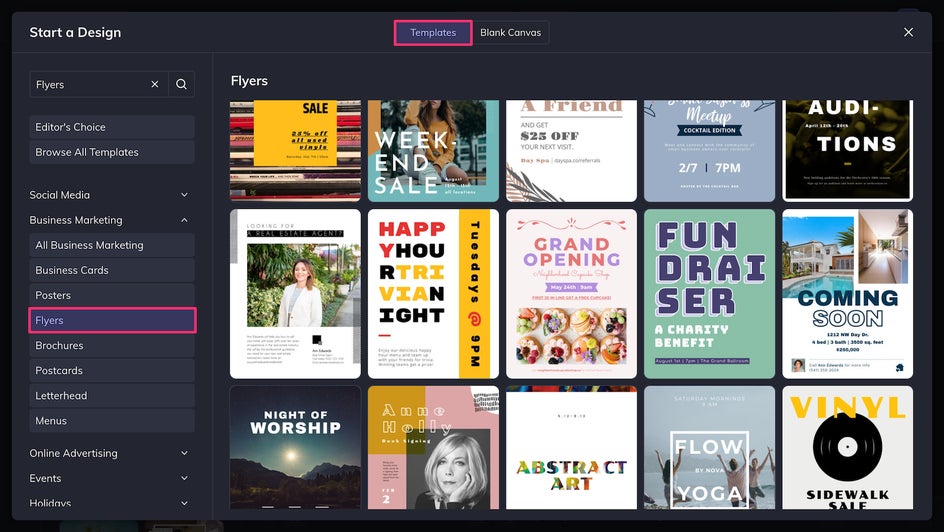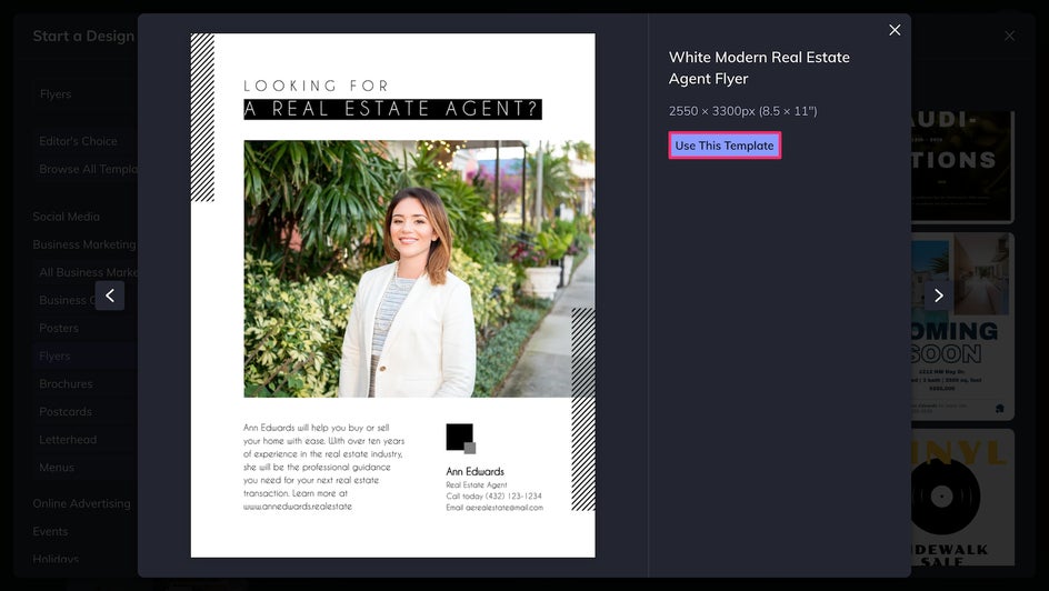 Once you’re in the Graphic Designer, you’ll be able to pick from dozens of handcrafted templates. In the left-hand sidebar, choose the template category that best fits your purpose – in this case, Business Marketing to Flyer. Then, browse through the available templates and select one that’s specifically designed for real estate.