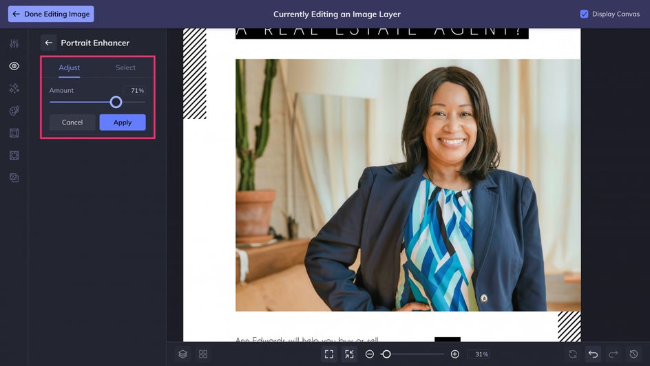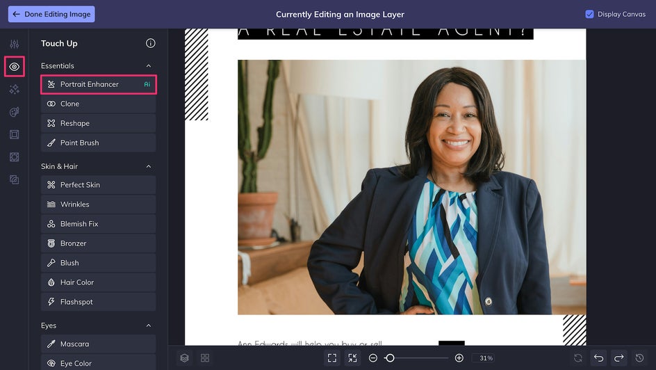 Here you’ll have all the tools of the Editor at your disposal without ever leaving the Graphic Designer. To instantly elevate your real estate flyer, first head on over to the Touch Up tab and select Portrait Enhancer.