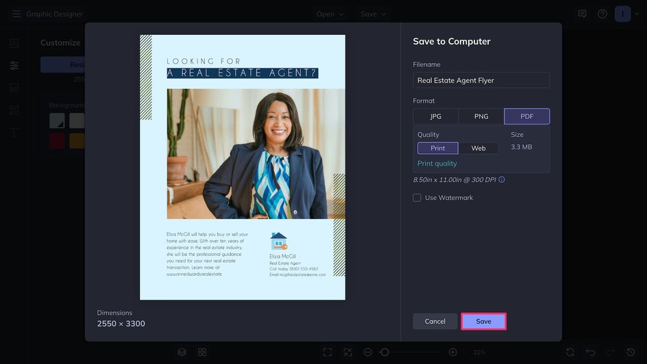 Once you’re satisfied, just click Save at the top of the page your file in your preferred format. Note that a high-quality print PDF will work best for a printed flyer like this one.