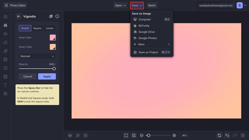 Once you are satisfied with the colors you have chosen and how the Vignette appears, click the Save button at the top of your canvas and select your desired save location.