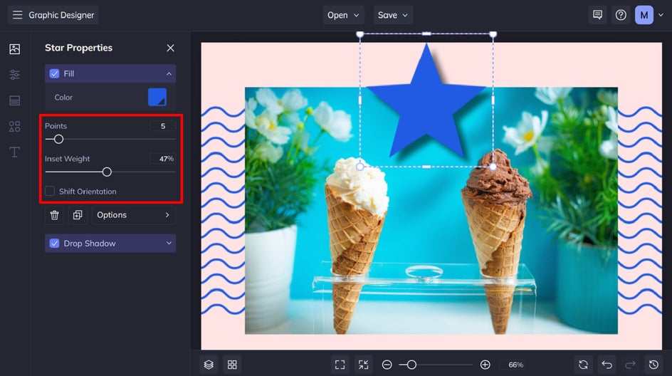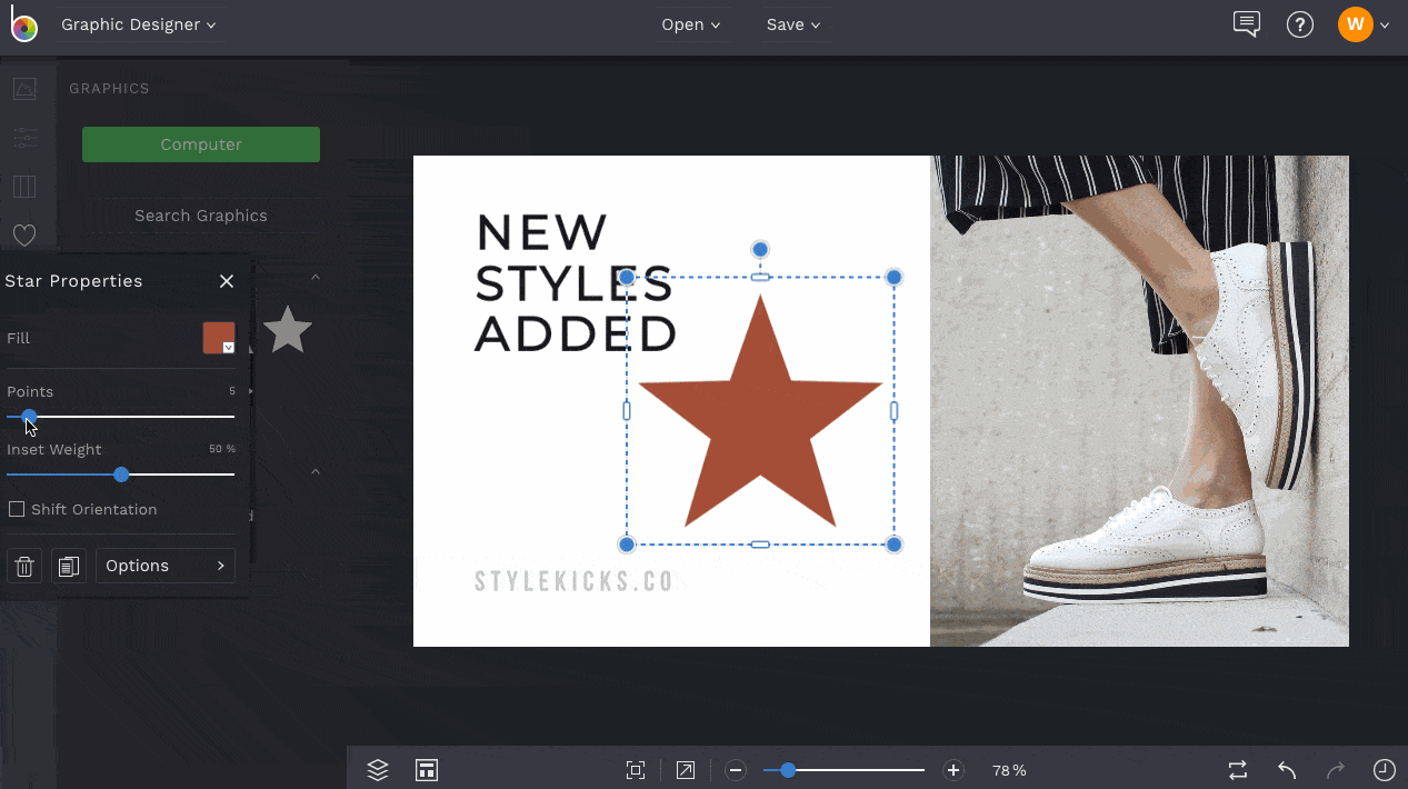 The Star Properties panel, for example, has a Points slider that allows you to increase or decrease the number of points in your star shape. In addition, you can use the Inset Weight slider to increase or decrease the thickness of the points.